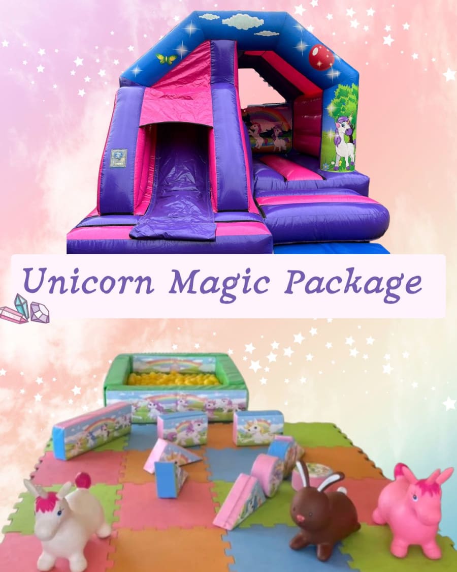 Book the Bouncy castle Soft play package hire Unicorn Magic Package in Ilford, East London, Romford Essex for a worry-free celebration. Our package caters to toddlers and young kids. Adults relax while children explore, climb and slide in a secure space. πΆπ